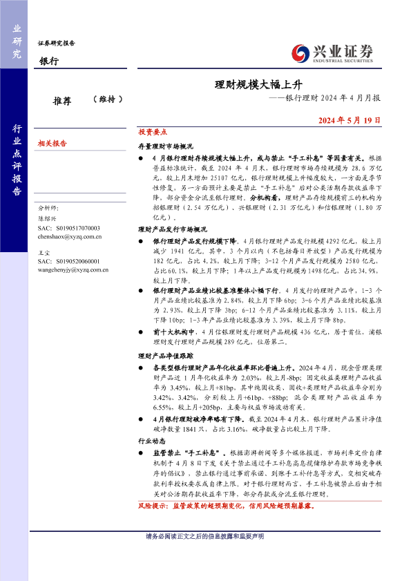 【兴业证券】【20240519】银行业理财2024年4月月报:理财规模大幅上升-13页