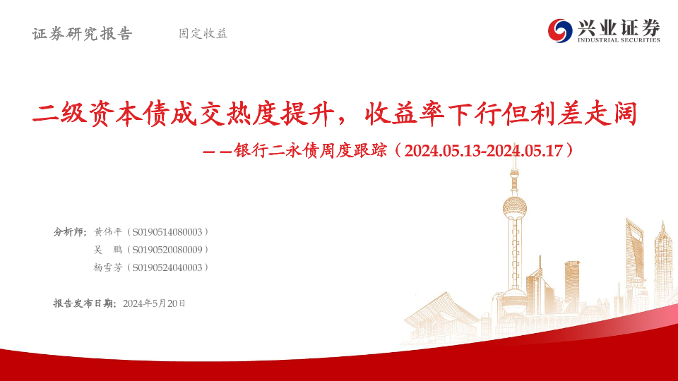 【兴业证券】【20240520】银行二永债跟踪:二级资本债成交热度提升,收益率下行但利差走阔-40页