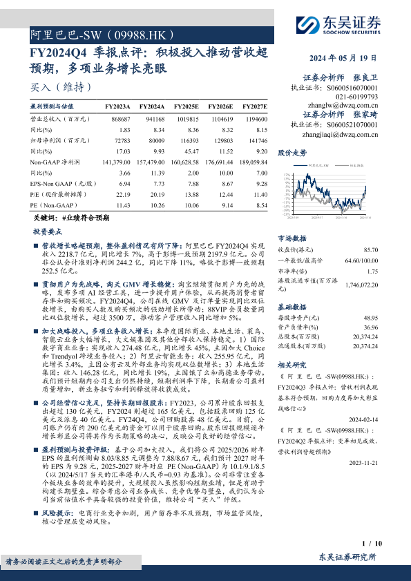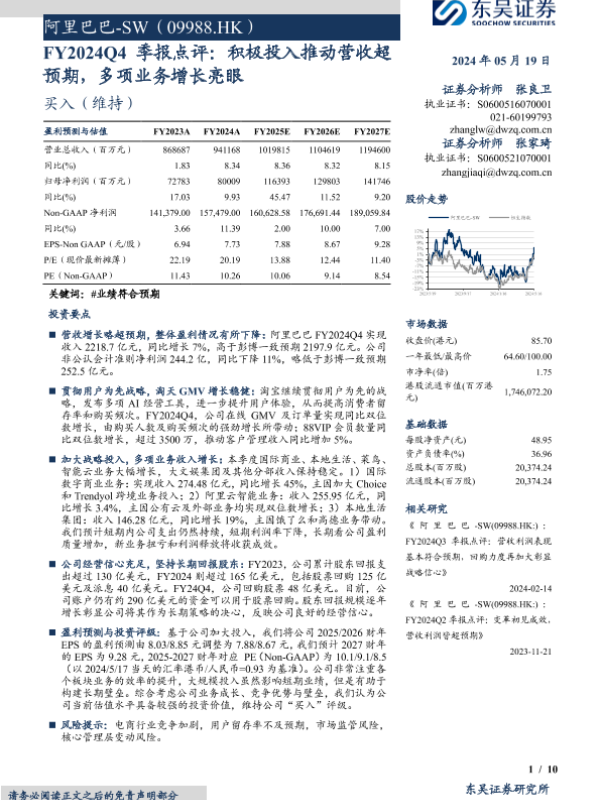 【东吴证券】【20240519】阿里巴巴-SW(09988.HK)FY2024Q4季报点评:积极投入推动营收超预期,多项业务增长亮眼-10页