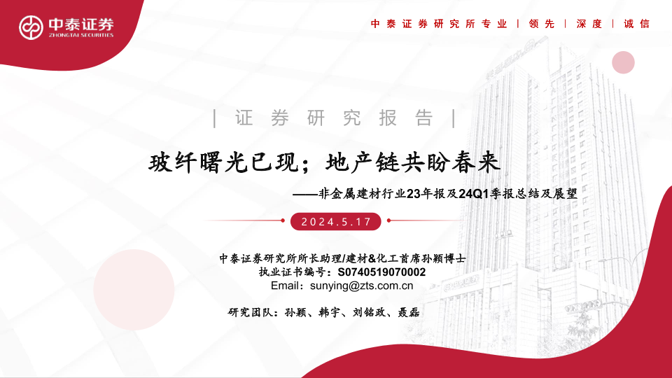 【中泰证券】【20240517】非金属建材行业23年报及24Q1季报总结及展望:玻纤曙光已现;地产链共盼春来-87页