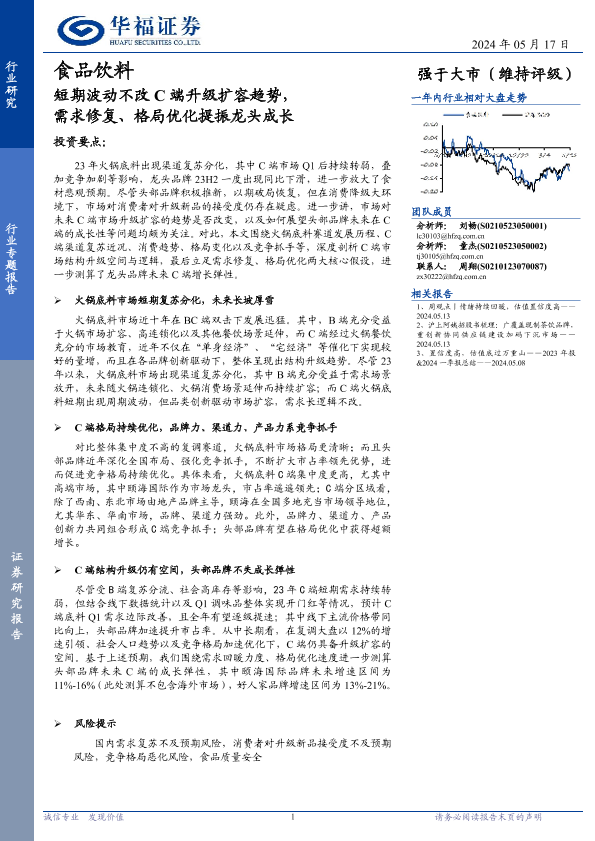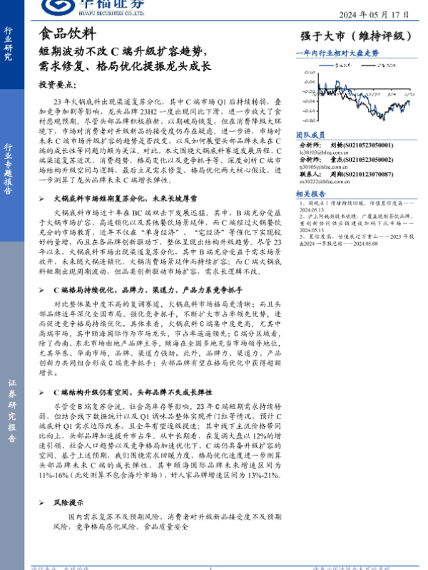 【华福证券】【20240517】食品饮料行业专题报告:短期波动不改C端升级扩容趋势,需求修复、格局优化提振龙头成长-12页