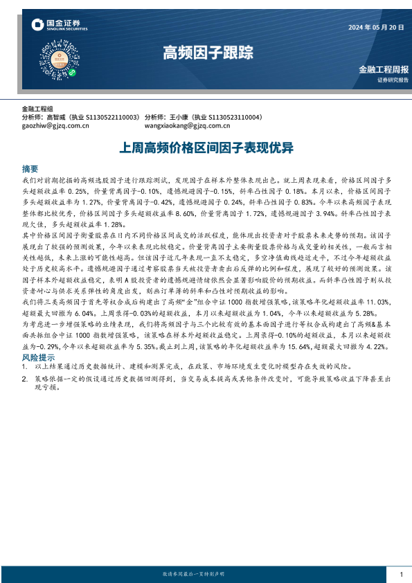 【国金证券】【20240520】高频因子跟踪:上周高频价格区间因子表现优异-16页