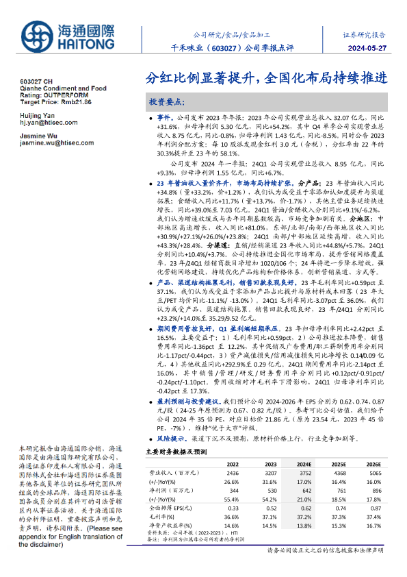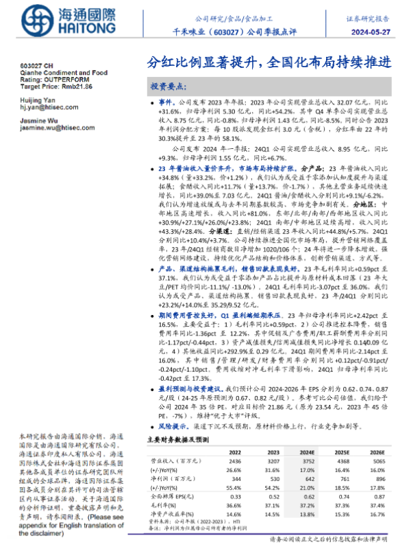 【海通国际】【20240527】千禾味业(603027)公司季报点评:分红比例显著提升,全国化布局持续推进-12页