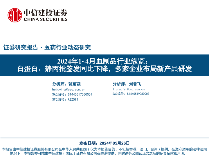 【中信建投证券】【20240526】2024年1-4月血制品行业纵览:白蛋白、静丙批签发同比下降,多家企业布局新产品研发-71页