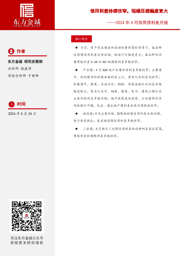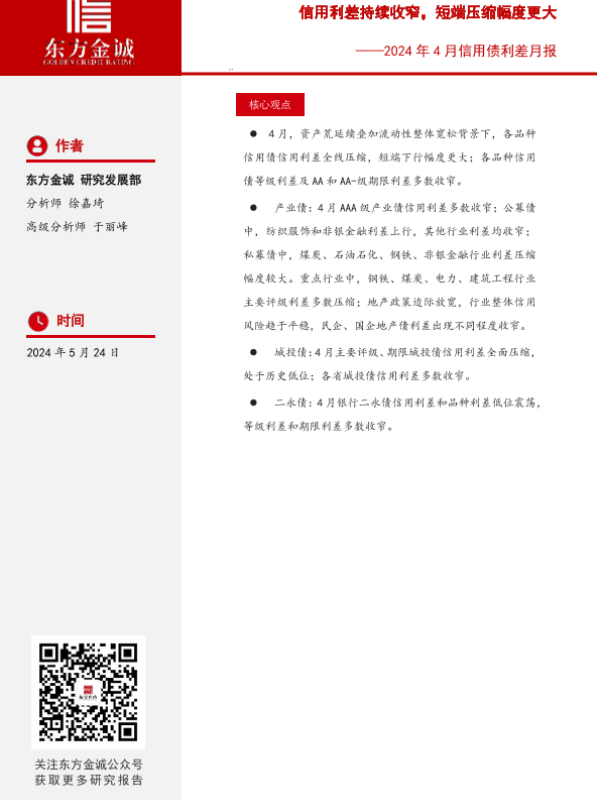 【东方金诚】【20240524】2024年4月信用债利差月报:信用利差持续收窄,短端压缩幅度更大-15页