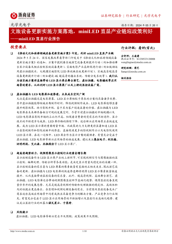 【浙商证券】【20240526】miniLED直显行业报告:文旅设备更新实施方案落地,miniLED直显产业链迎政策利好-10页