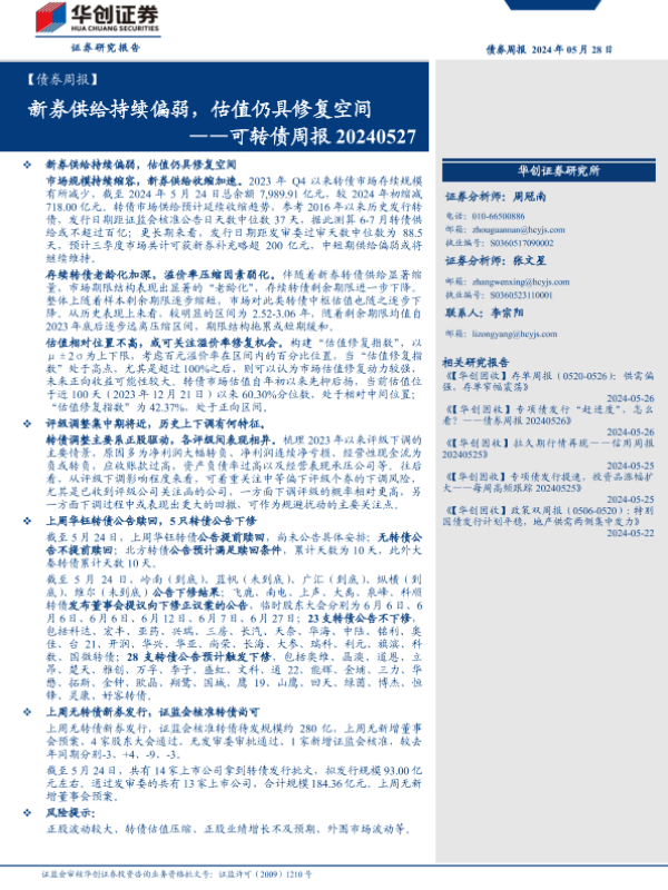【华创证券】【20240528】可转债:新券供给持续偏弱,估值仍具修复空间-18页