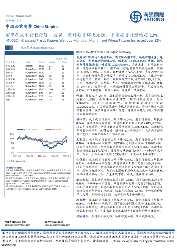 【海通国际】【20240527】中国必需消费行业消费品成本指数跟踪:玻璃、塑料期货环比走强,小麦期货月涨幅超12%-16页