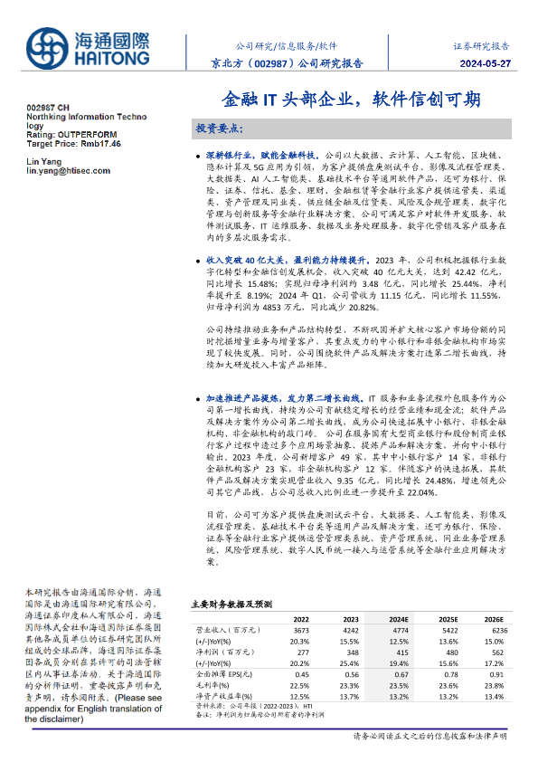 【海通国际】【20240527】京北方(002987)金融IT头部企业,软件信创可期-13页