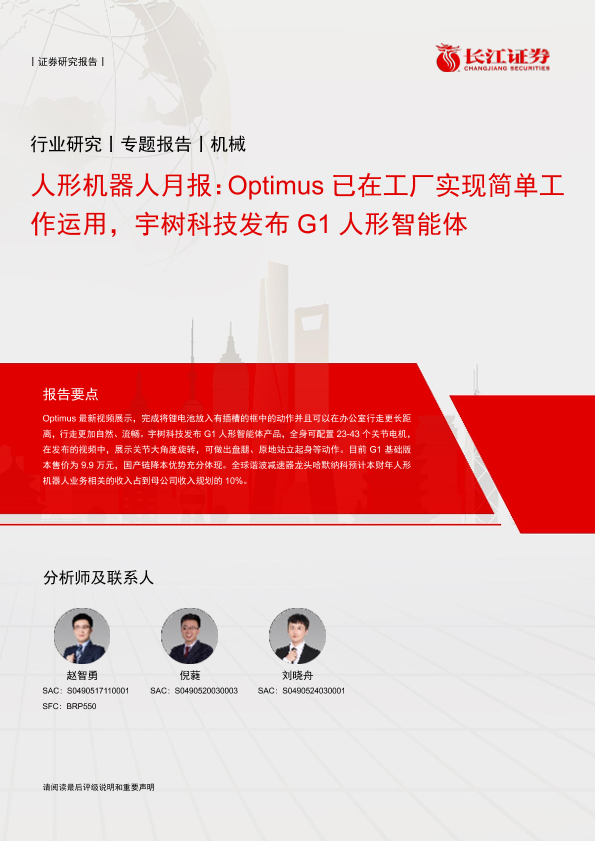 【长江证券】【20240529】人形机器人行业月报:Optimus已在工厂实现简单工作运用,宇树科技发布G1人形智能体-10页