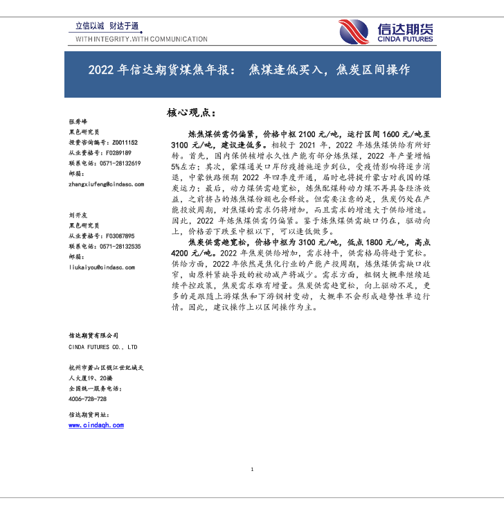 【信达期货】【20211220】2022年信达期货煤焦年报:焦煤逢低买入,焦炭区间操作-22页