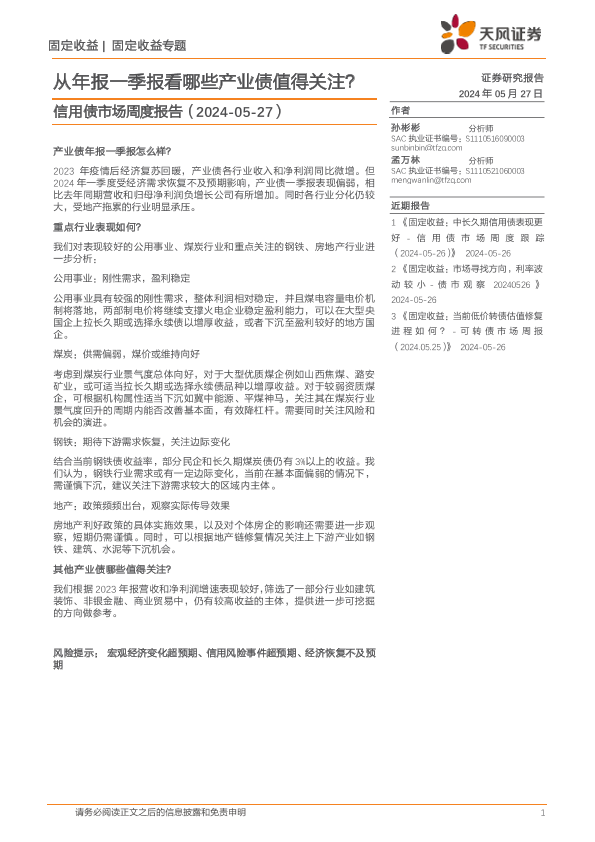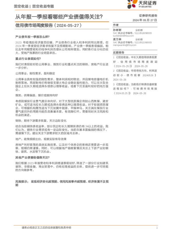 【天风证券】【20240527】信用债市场报告:从年报一季报看哪些产业债值得关注?-17页