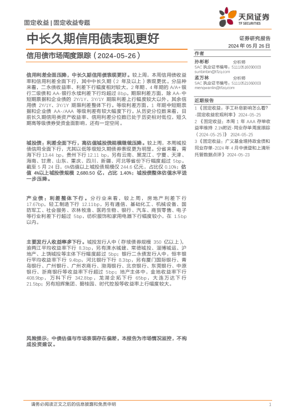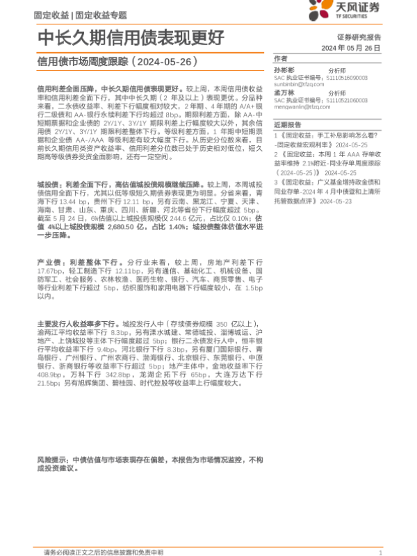 【天风证券】【20240526】信用债市场跟踪:中长久期信用债表现更好-13页