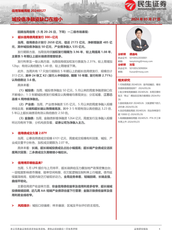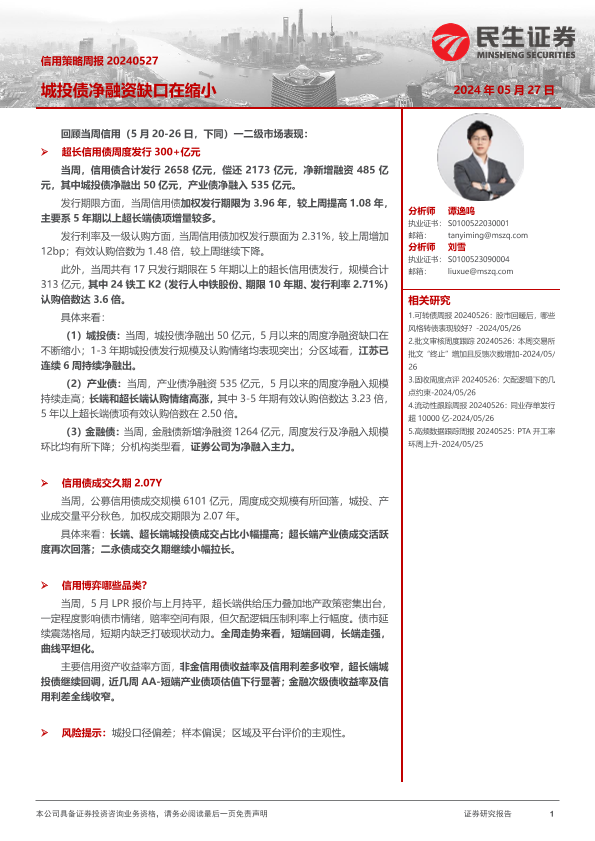 【民生证券】【20240527】信用策略:城投债净融资缺口在缩小-27页