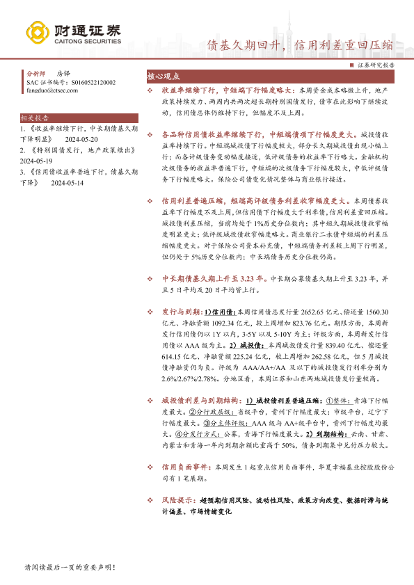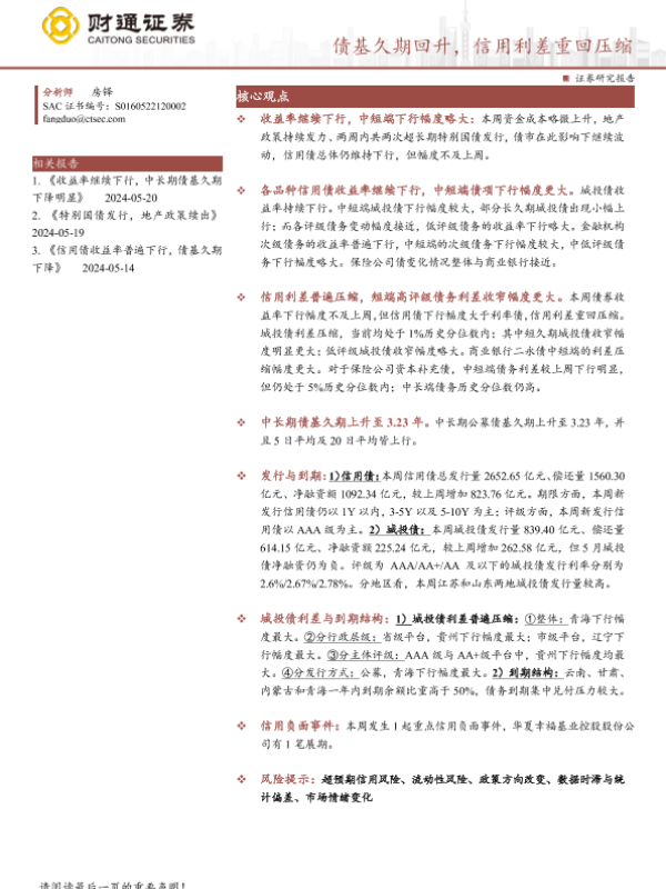 【财通证券】【20240526】债基久期回升,信用利差重回压缩-14页