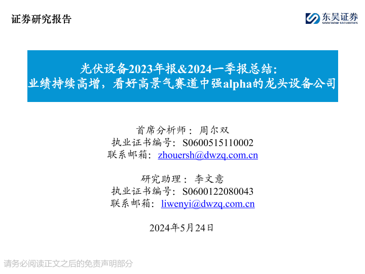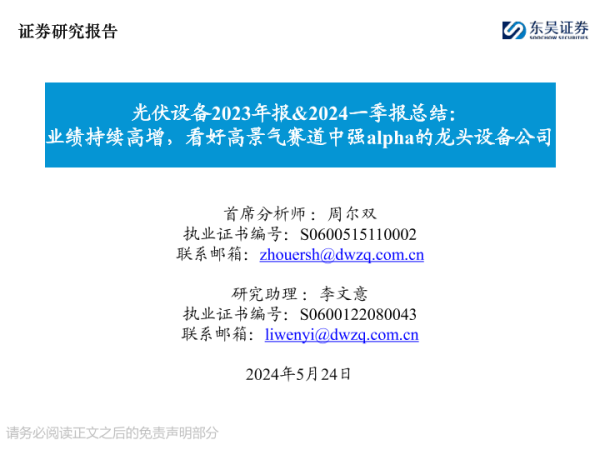 【东吴证券】【20240524】光伏设备2023年报&2024一季报总结:业绩持续高增,看好高景气赛道中强alpha的龙头设备公司-34页