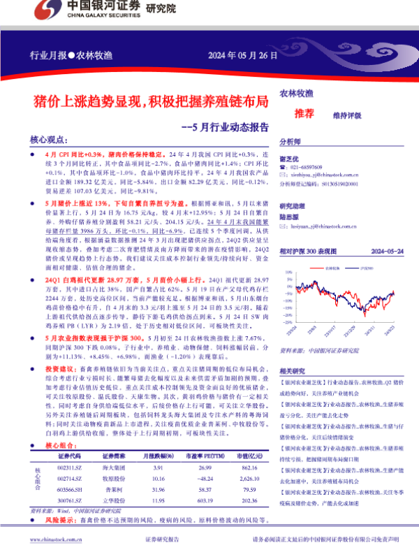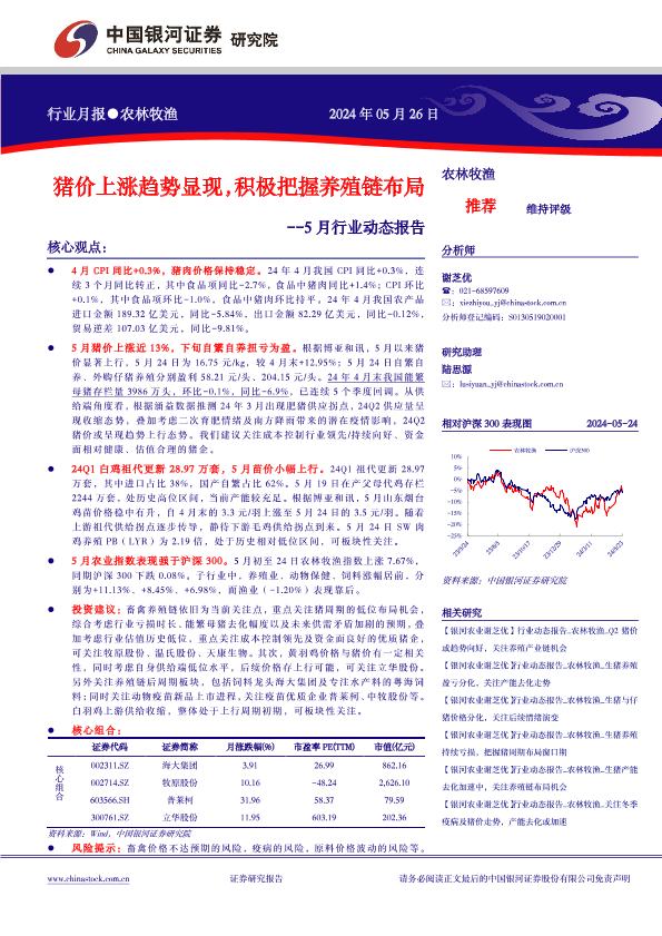 【银河证券】【20240526】农林牧渔行业5月行业动态报告:猪价上涨趋势显现,积极把握养殖链布局-22页