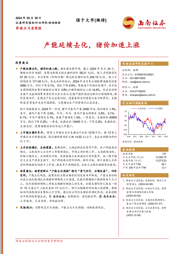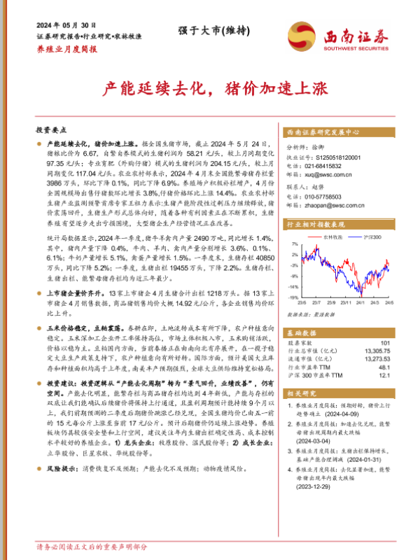 【西南证券】【20240530】农林牧渔行业养殖业月度简报:产能延续去化,猪价加速上涨-11页