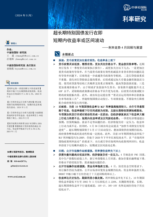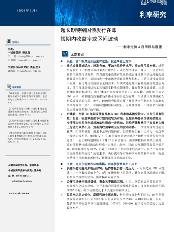 【中诚信国际】【20240530】利率走势4月回顾与展望:超长期特别国债发行在即,短期内收益率或区间波动-10页