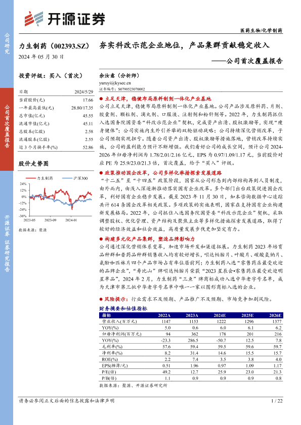 【开源证券】【20240530】力生制药(002393)公司首次覆盖报告:夯实科改示范企业地位,产品集群贡献稳定收入-22页