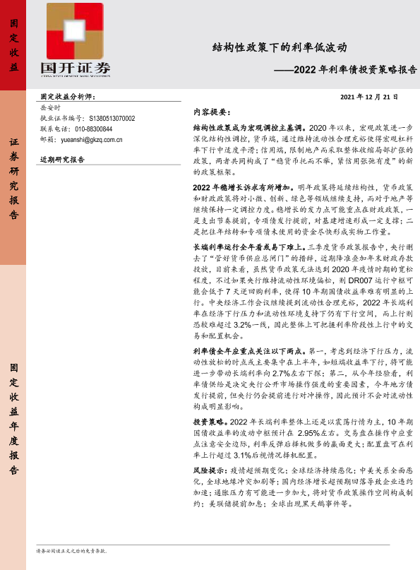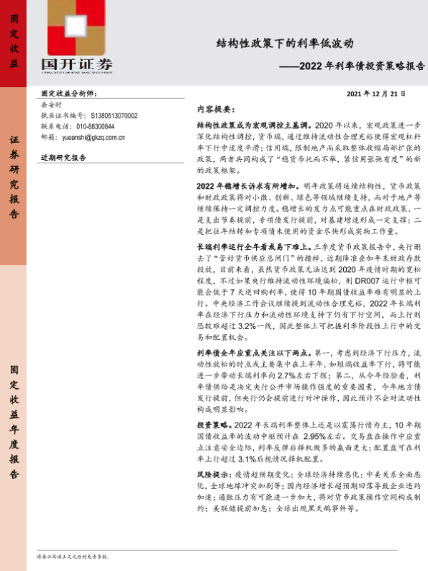 【国开证券】【20211221】结构性政策下的利率低波动——2022年利率债投资策略报告-20页
