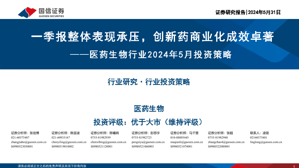 【国信证券】【20240531】医药生物行业2024年5月投资策略:一季报整体表现承压,创新药商业化成效卓著-37页
