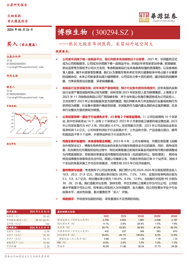 【华源证券】【20240523】博雅生物-依托大股东华润医药,采浆站外延空间大-15页