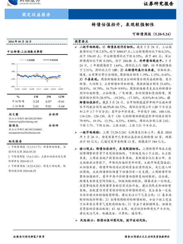 【财信证券】【20240528】可转债(5.20-5.24):转债估值抬升,表现较强韧性-10页