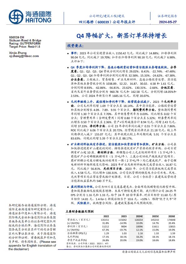 【海通国际】【20240527】四川路桥(600039)Q4降幅扩大,新签订单保持增长-12页