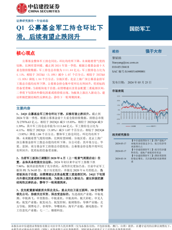 【中信建投证券】【20240525】国防军工行业:Q1公募基金军工持仓环比下滑,后续有望止跌回升-25页