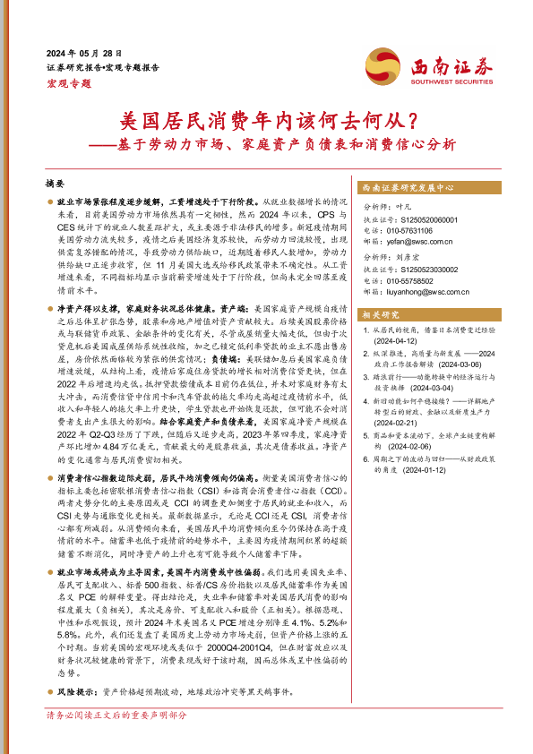 【西南证券】【20240528】基于劳动力市场、家庭资产负债表和消费信心分析:美国居民消费年内该何去何从?-20页