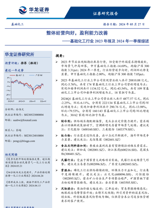 【华龙证券】【20240527】基础化工行业2023年报及2024年一季报综述:整体经营向好,盈利能力改善-28页
