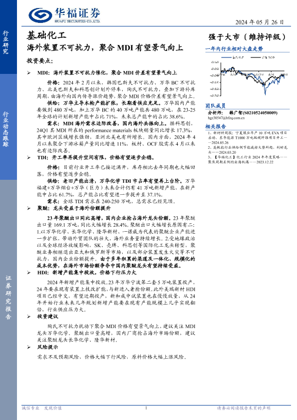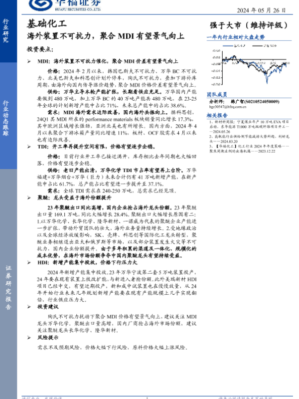 【华福证券】【20240526】基础化工行业动态跟踪:海外装置不可抗力,聚合MDI有望景气向上-12页