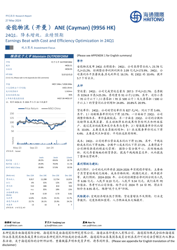 【海通国际】【20240527】安能物流(9956.HK)24Q1,降本增效,业绩预期-13页