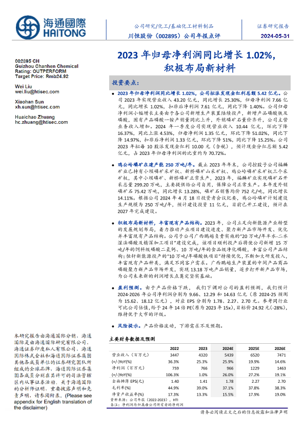 【海通国际】【20240531】川恒股份(002895)公司年报点评:2023年归母净利润同比增长1.02%,积极布局新材料-13页