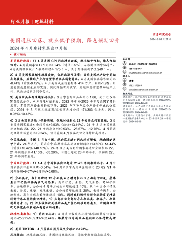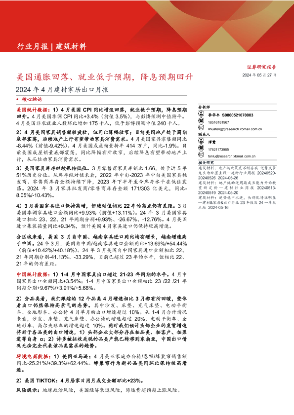 【西部证券】【20240527】建筑材料行业2024年4月建材家居出口月报:美国通胀回落、就业低于预期,降息预期回升-22页