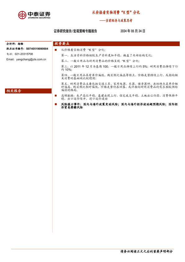 【中泰证券】【20240524】当前经济与政策思考:从价格看实物消费“K型”分化-16页