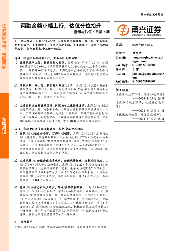 【甬兴证券】【20240527】情绪与估值5月第2期:两融余额小幅上行,估值分位抬升-10页