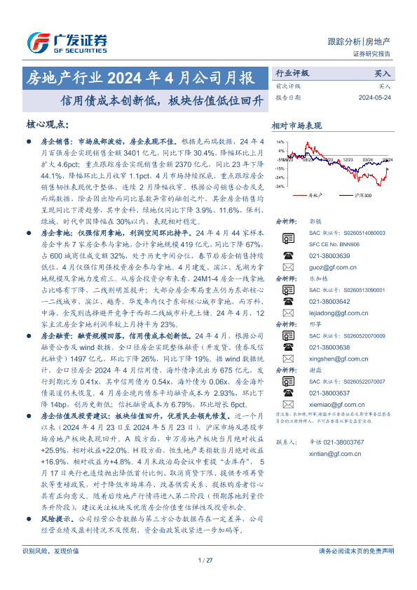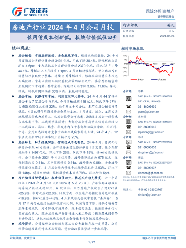 【广发证券】【20240524】房地产行业2024年4月公司月报:信用债成本创新低,板块估值低位回升-27页
