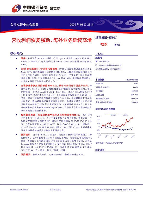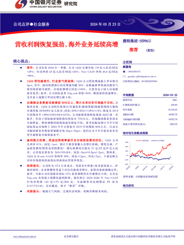 【银河证券】【20240523】携程集团-S(9961.HK)营收利润恢复强劲,海外业务延续高增-10页