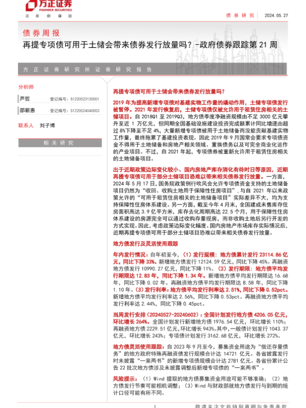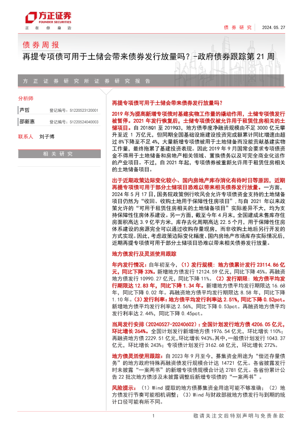 【方正证券】【20240527】政府债券跟踪:再提专项债可用于土储会带来债券发行放量吗?-16页