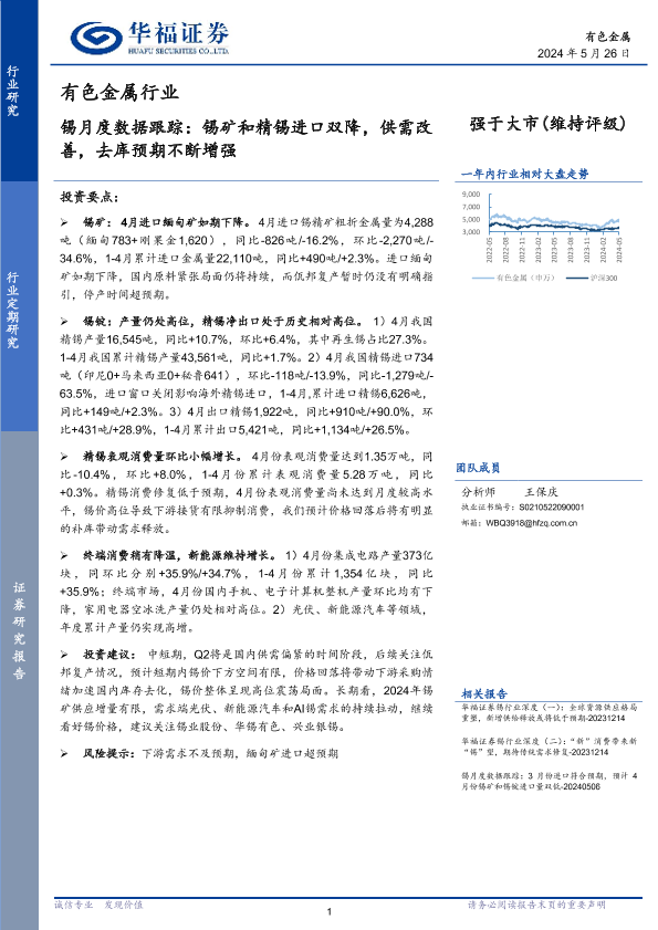 【华福证券】【20240526】有色金属行业锡月度数据跟踪:锡矿和精锡进口双降,供需改善,去库预期不断增强-11页