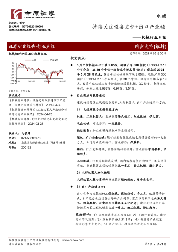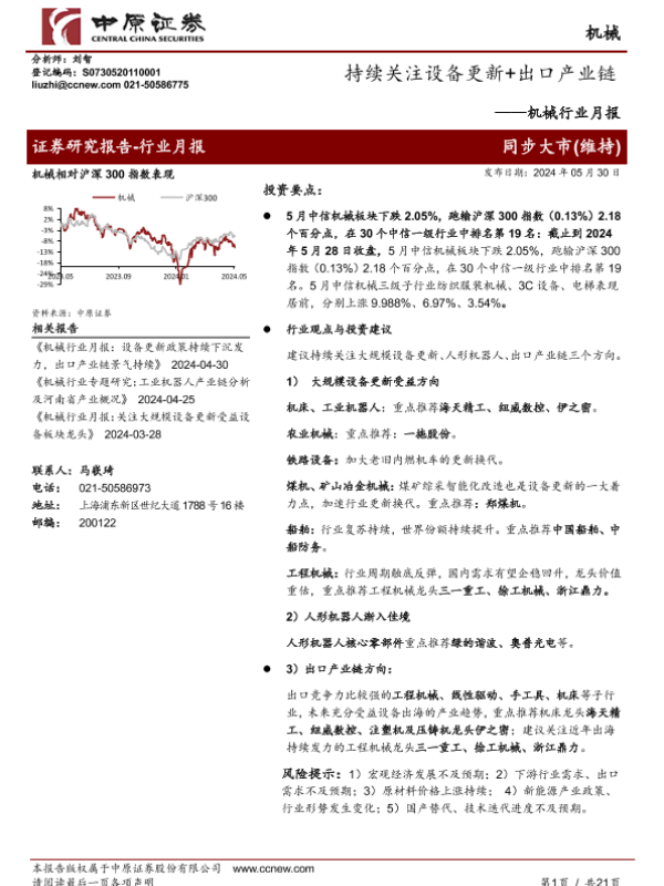【中原证券】【20240530】机械行业月报:持续关注设备更新+出口产业链-21页