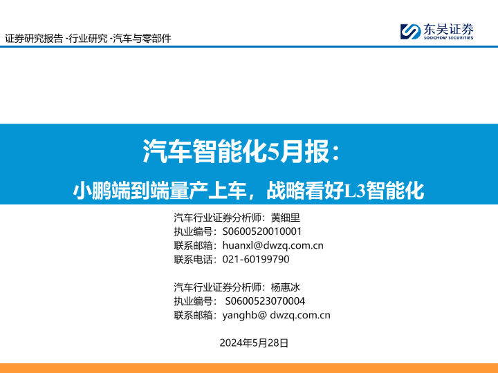 【东吴证券】【20240528】汽车与零部件行业汽车智能化5月报:小鹏端到端量产上车,战略看好L3智能化-33页