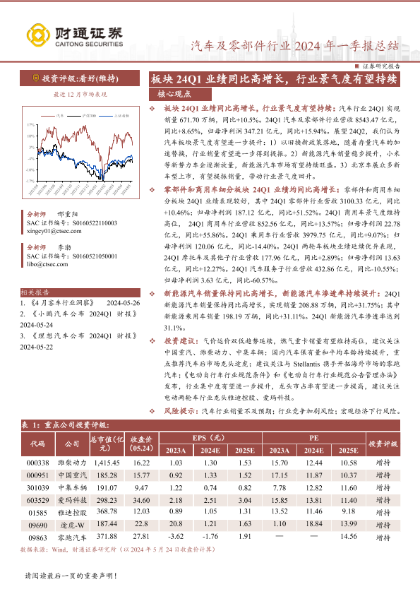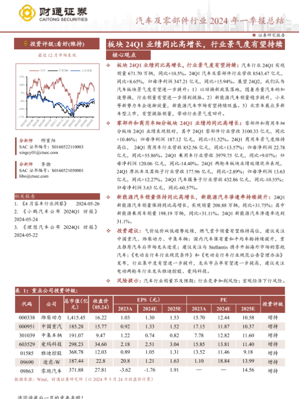 【财通证券】【20240527】汽车及零部件行业2024年一季报总结:板块24Q1业绩同比高增长,行业景气度有望持续-19页