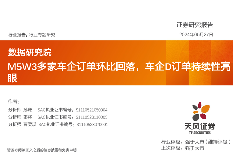 【天风证券】【20240527】M5W3多家车企订单环比回落,车企D订单持续性亮眼-11页