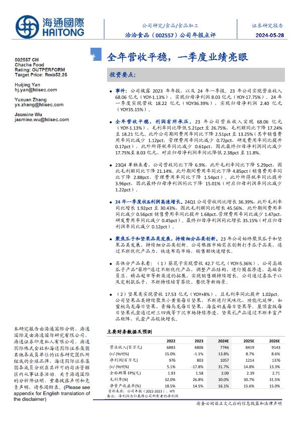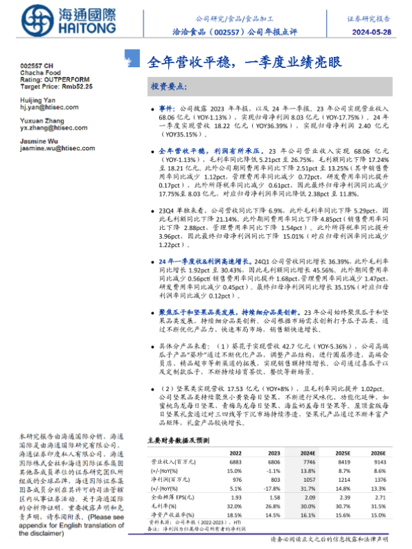 【海通国际】【20240528】洽洽食品-002557.SZ-公司年报点评:全年营收平稳,一季度业绩亮眼-11页