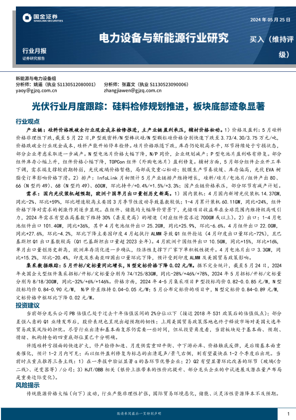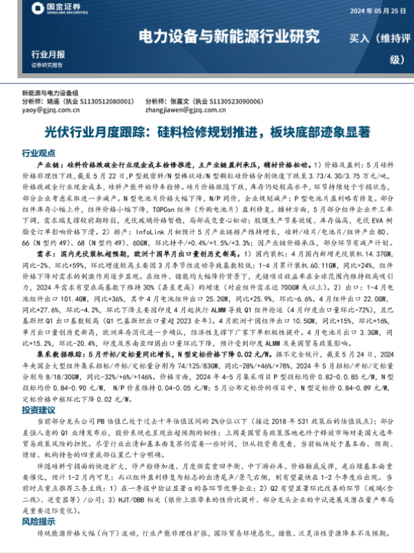 【国金证券】【20240525】电力设备与新能源还会有光伏行业月度跟踪:硅料检修规划推进,板块底部迹象显著-20页
