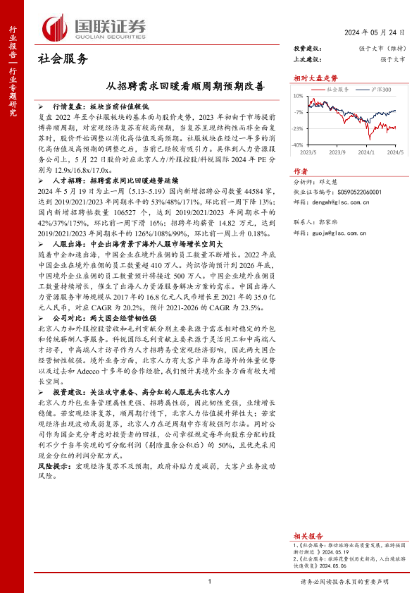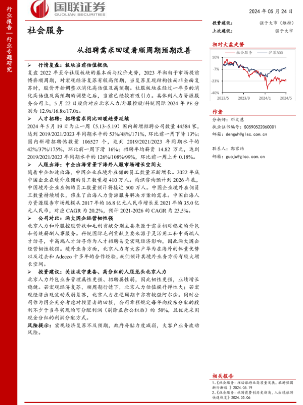 【国联证券】【20240524】社会服务行业专题研究:从招聘需求回暖看顺周期预期改善-11页