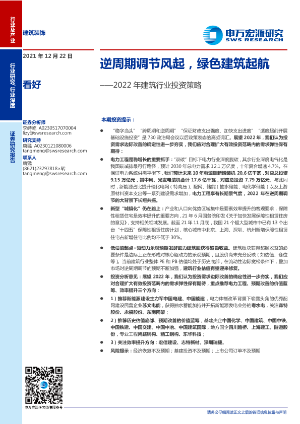 投资策略 电力工程 绿色建筑 逆周期调节 建筑行业